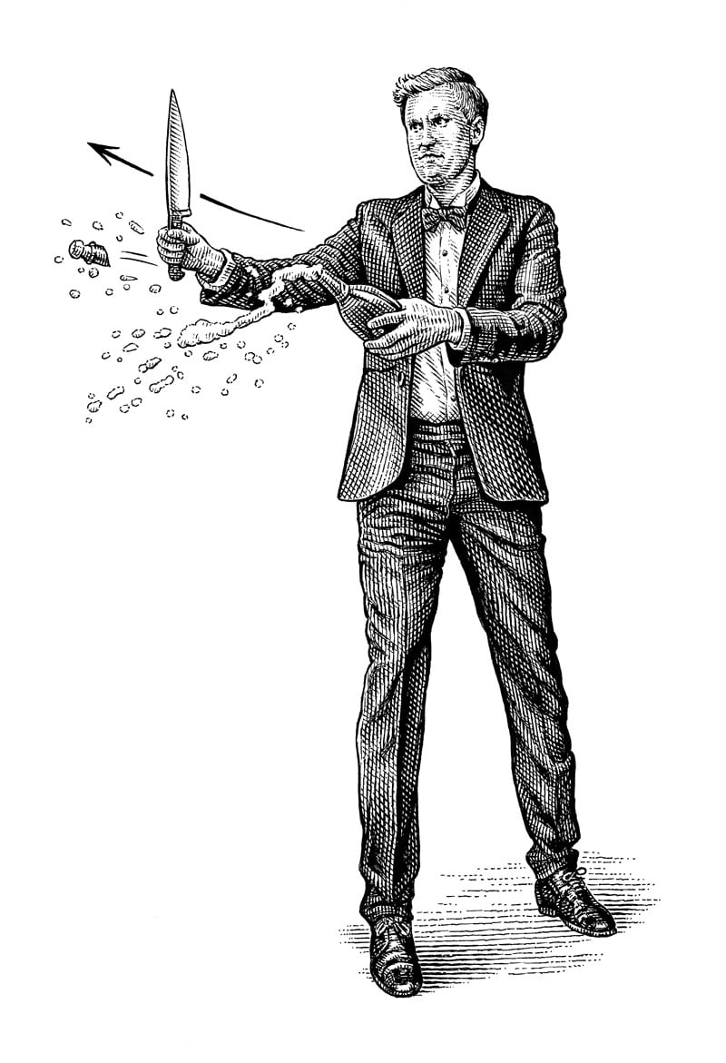 Another much-attempted trick is The Sommelier and the Sabre (above). In choosing equipment, it is important to remember that it is not a weapon that is useful here, but a blunt-edged instrument. While a spatula lacks the romance of a sword, it would be more effective; a sabre only has one sharp edge and that edge is redundant. The experienced sommelier knows that a combination of exterior impact with interior pressure allows the top of the bottle to be sliced off with ease.