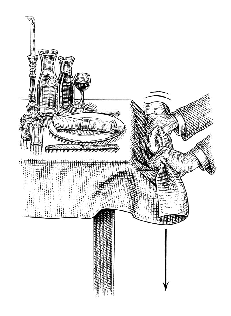 The tabletop must be perfectly smooth, with no adjustable panels breaking the line, and standing level on the floor. Ask guests to stand at a respectful distance and then firmly grasp the cloth (on a short, unhemmed side) with both hands.