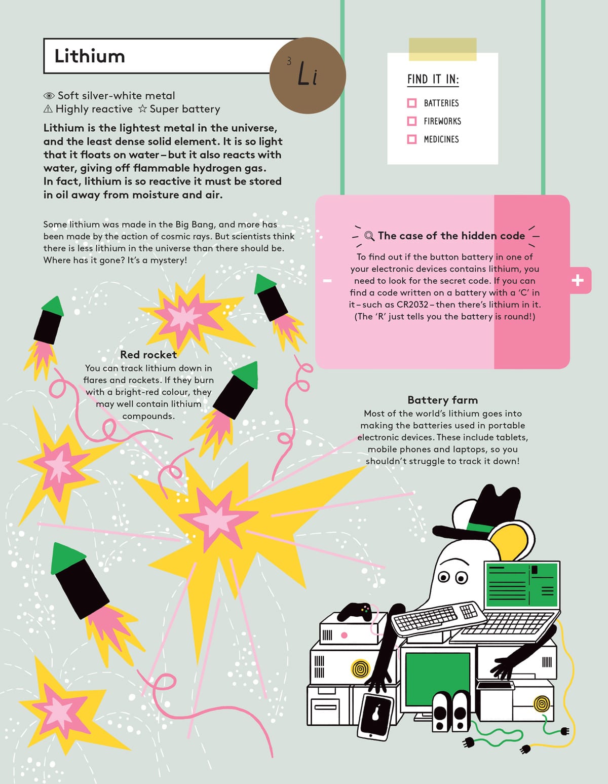 Most of the world’s lithium goes into making the batteries used in portable electronic devices. These include tablets, mobile phones and laptops, so you shouldn’t struggle to track it down!