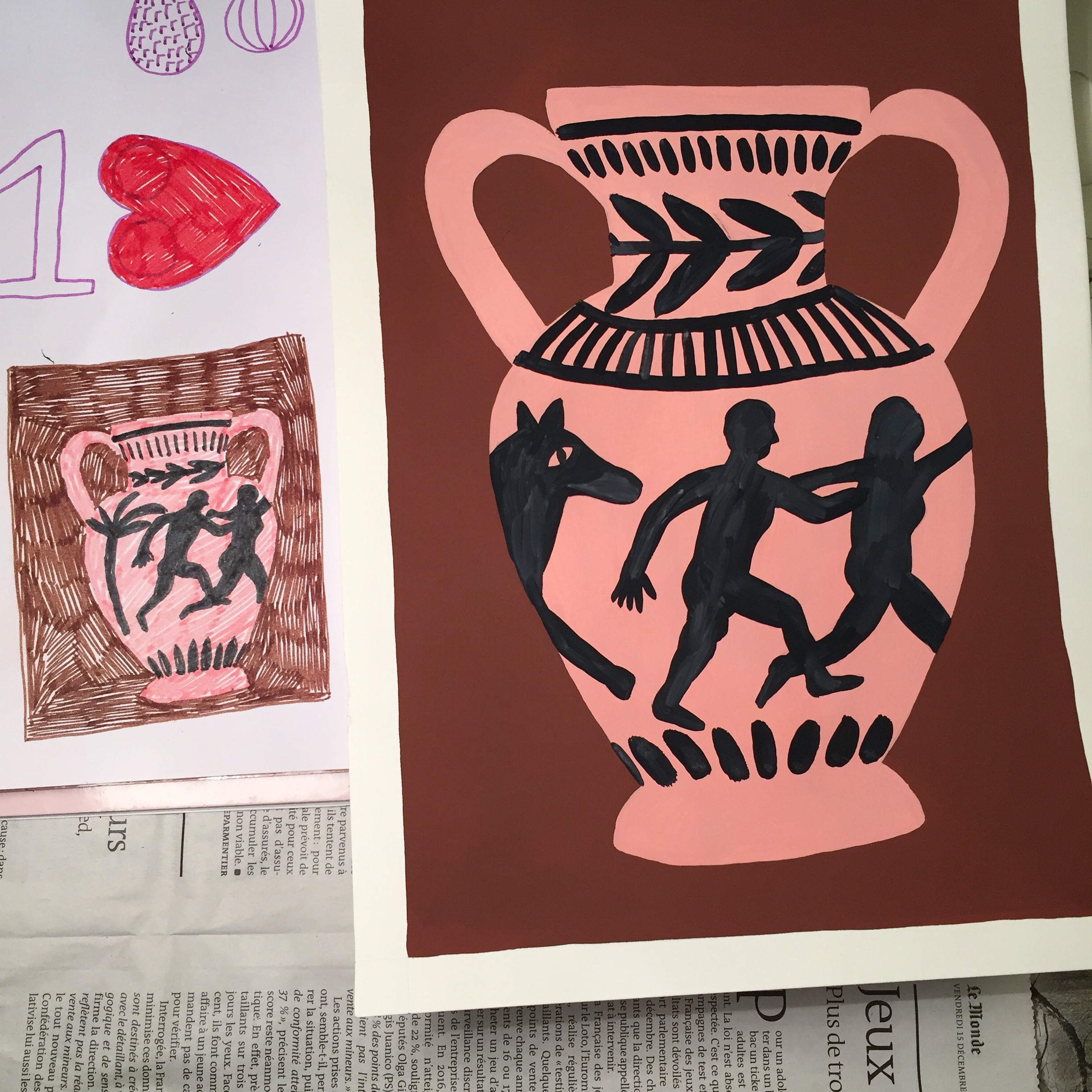 I love working with gouache on paper, felt-tip pens and I also work digitally for commissioned projects.