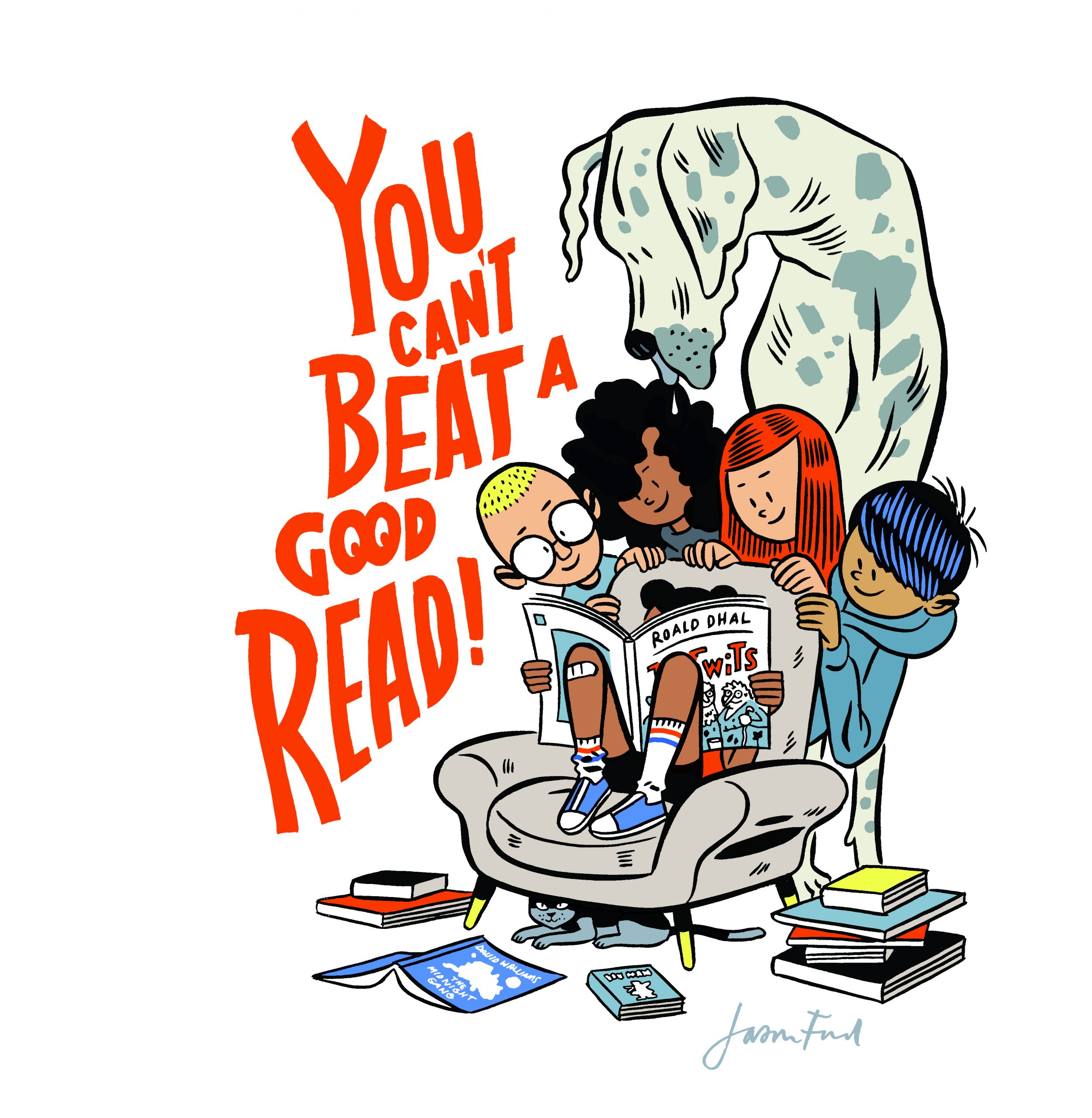 ‘When I came up with this illustration, I was primarily thinking about my 9-year-old daughter and the books she enjoyed either being read to or reading by herself. She’s a big fan of Roald Dhal with Dav Pilkey’s Dog Man series coming a close second, followed by the occasional foray into David Walliams’ books, especially The Midnight Gang. I also wanted to develop the idea that a good book attracts other readers. The big dog looming over them is just a bit of fun.’
