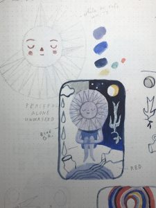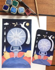 I get asked about the artists process, a lot! With this deck, and with many of my recent projects, I aim for a blend of 80% analogue —> 20% digital. I use handmade watercolour palettes that have been selected and isolated in little travel tins (sometimes I do my best work on the go, or I have to get away entirely to really focus). I painted most of the cards entirely, but left off any details that I wasn’t sure about, sometimes the face or sometimes the shape of a cloud. In photoshop, I could create a layer and try out different solutions, before committing. Which also saved time, which is important when you are on a deadline!