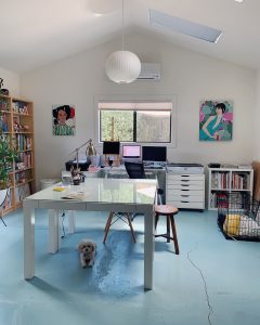 I start my day with answering emails, then I do some yoga, walk my dog, and cross my backyard to my home studio. From there, every day is different. Sometimes it means working on my iPad for client work, sometimes creating paintings, or packaging up orders from my online shop. I end the day with another walk and then a home cooked dinner.