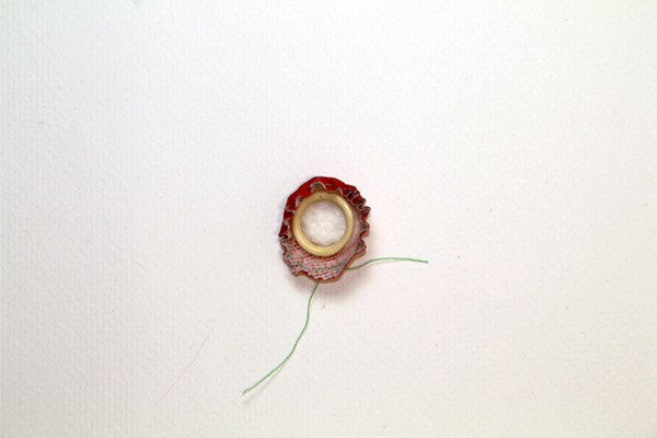 Place a small amount of batting under the ring, making sure it extends to the outside edge of the ring. Here a piece of a cotton ball was used, but quilt batting works well too.