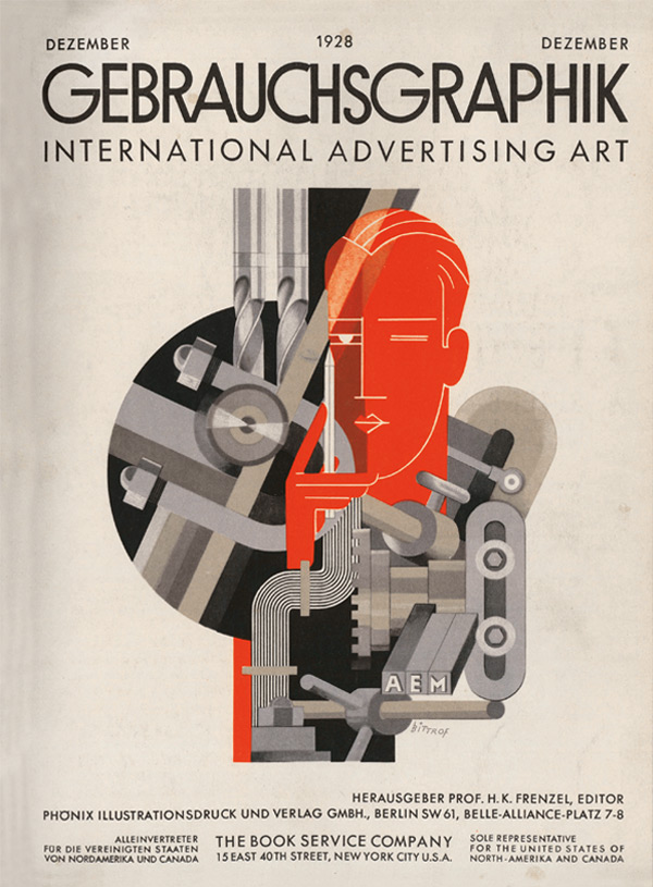Technology provides the model for the clean, smooth techno-deisgn look of ‘Form um 1930’: cover of the magazine ‘Gebrauchsgraphik’, December 1928. Illustration by Max Bittrof